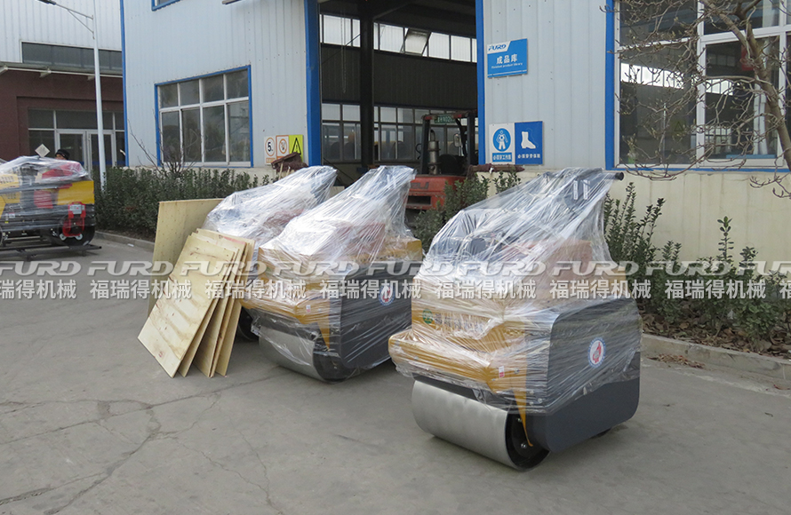 1月18日,福瑞得機械3臺手扶雙輪壓路機和兩臺座駕壓路機打包裝箱出口新加坡。