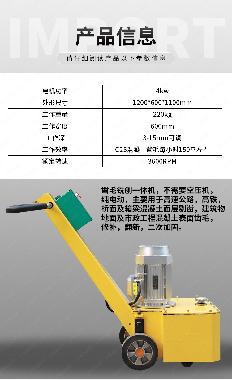 鑿毛銑刨一體機(jī),不需要空壓機(jī),純電動,主要用于高速公路,高鐵,橋面及箱梁混凝土面層剔鑿,建筑物地面及市政工程混凝土表面鑿毛,修補(bǔ),翻新,二次加固。