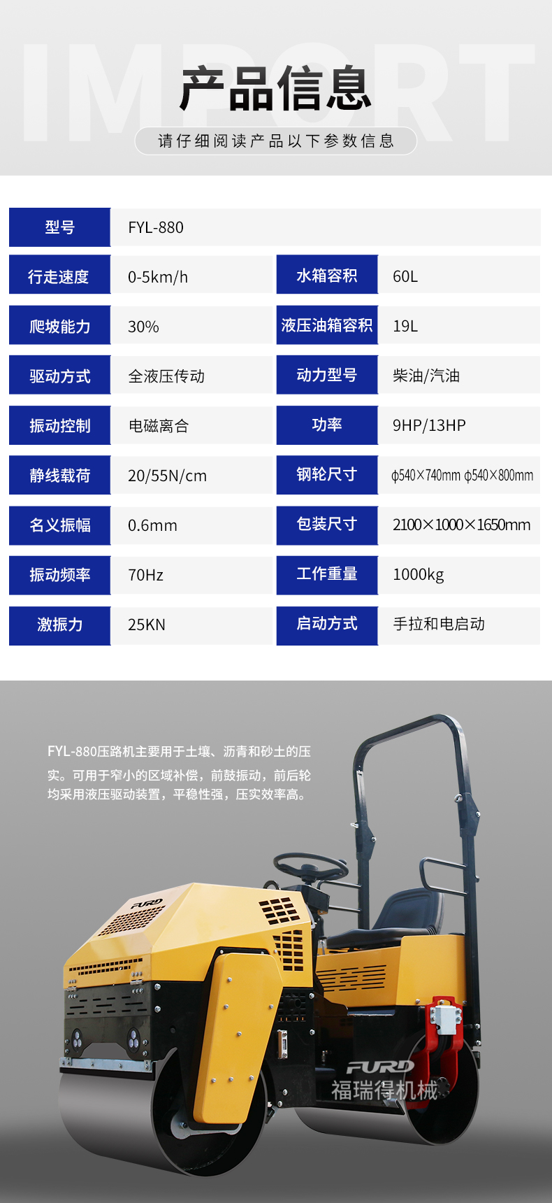 主要用于溝渠基礎(chǔ),道路,體育場地的壓實整平,也可用于壓實瀝青表面的作業(yè)。