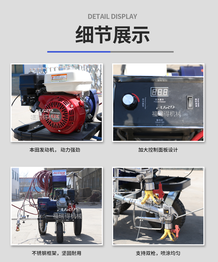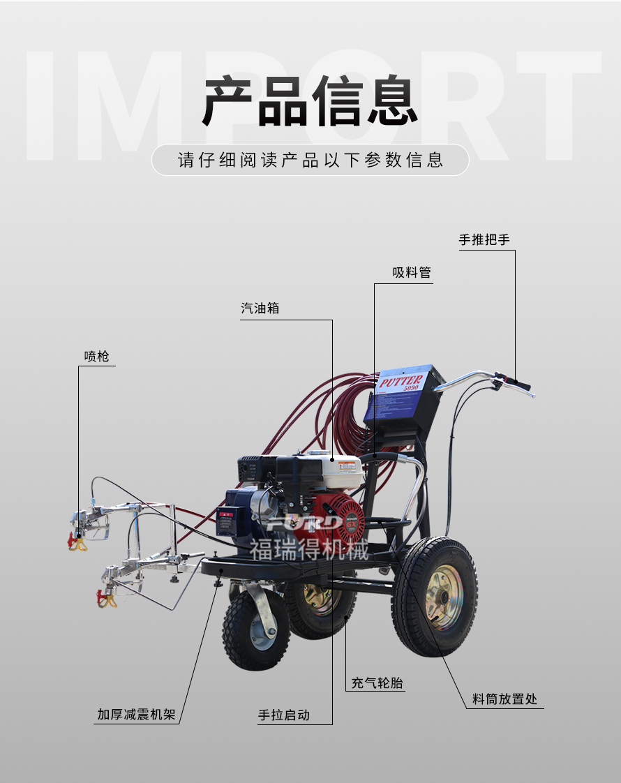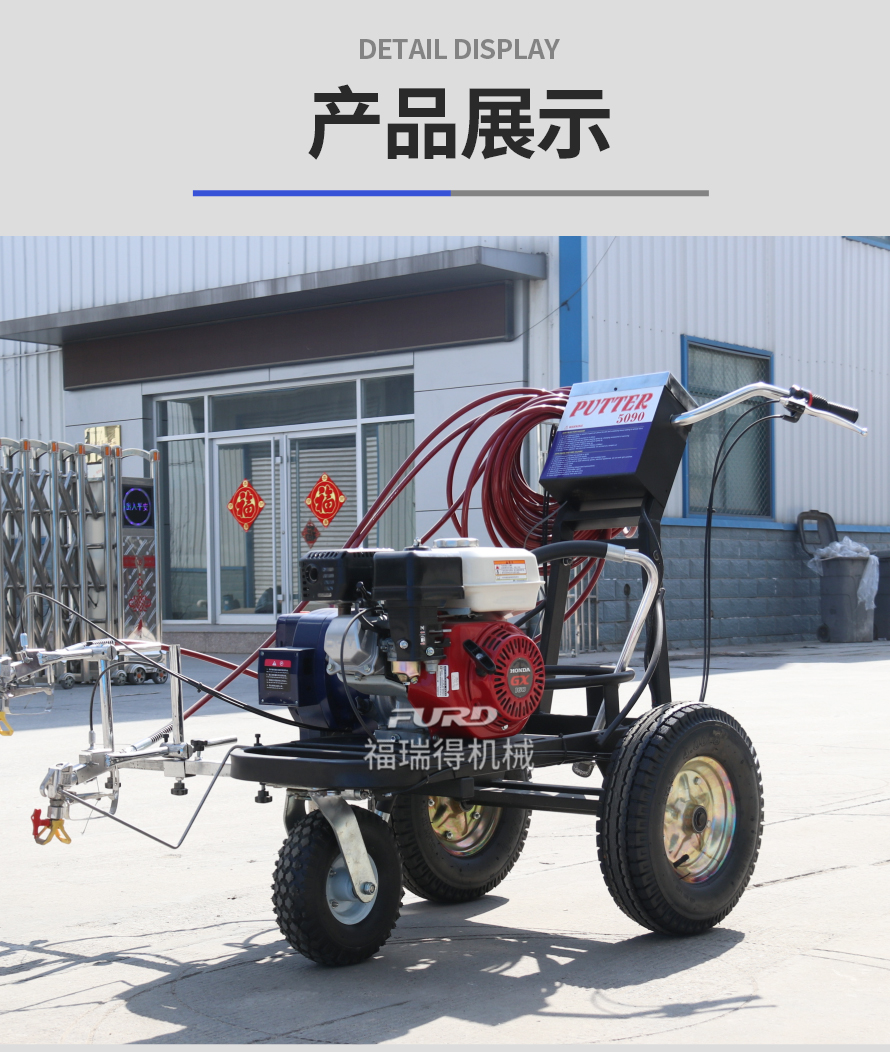 小型手推式道路劃線機(jī)是一種在道路、停車(chē)場(chǎng)、廣場(chǎng)和跑道等平整地面上劃出不同約束、指引和警示等規(guī)則限制標(biāo)志的路面施工機(jī)械。最常見(jiàn)的就是在馬路上劃斑馬線,在路上劃車(chē)庫(kù)線、停車(chē)線等等應(yīng)用于小型工程、短途施工,活動(dòng)方便,靈活操作。