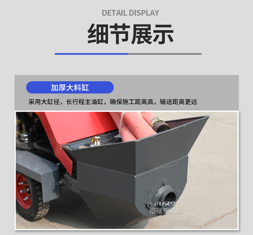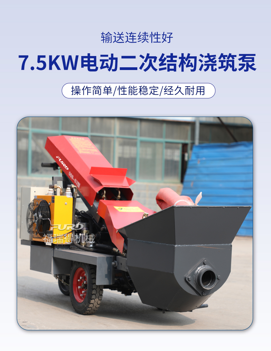 福瑞得二次結(jié)構(gòu)澆筑泵適用于商品房、農(nóng)村建房,打二次構(gòu)造柱,圈梁等,是您澆筑的好設備。電機功率小,體積小,重量輕,料斗可升降,真正能提高您的施工效率,是人工澆筑的幾十倍。
